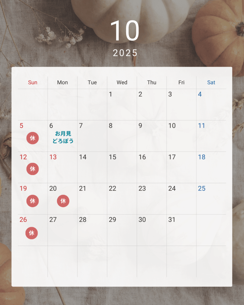 10月は定休日に加えて、20日(月)も休業日となります。よろしくお願いいたします。