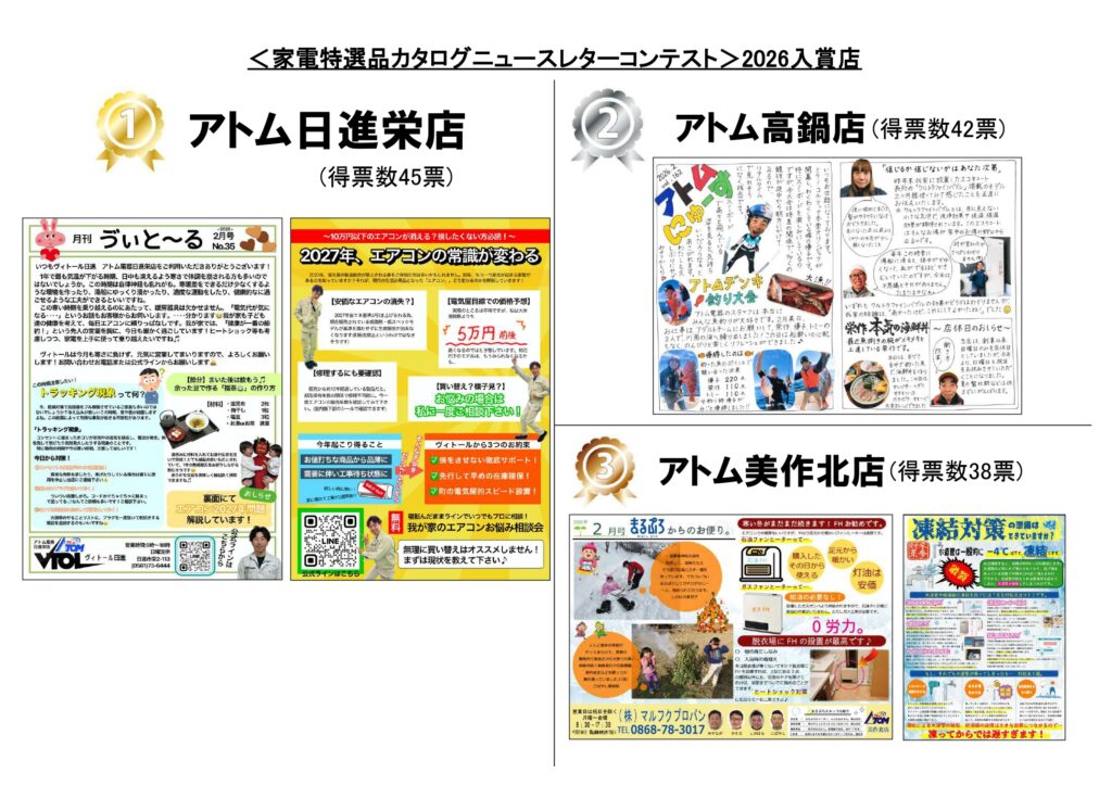 当店はアトム電器チェーンに所属しております。アトム電器では、毎年一回ニュースレターコンテストを開催しており、全国の店舗が心込めて制作しているニュースレターを投票にて3位まで選ばれます。当店はアトム電器に加入してから、コンテストに参加すること3回目。ついに一位を獲得することができました!!